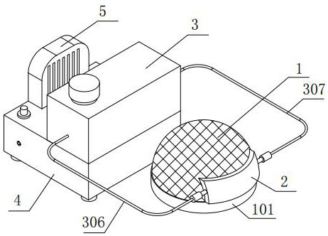 技术功效语段: [0019]本实用新型提供的头部降温装置主要由头部降温组件以及冷却液循环机构组成,将头部降温组件以及冷却液循环机构整合在一起,使用时可以直接放置在病床上,便于同患者一起转运,可以避免管路发生扯断的意外情况,同时无需外加人员转运该头部降温装置,可以有效缓解医护人员使用紧张的局面,此外,设置的头部降温组件用于为患者的头部降温,主要由网罩以及硅胶降温袋组成,设置的冷却液循环机构用于为硅胶降温袋提供冷却液,可以使得硅胶降温袋能够持续长时间地为患者头部提供稳定地低温降温环境,从而提高对患者大脑的保护效果,打破目前的头部护理降温装置在使用时存在的局限性。