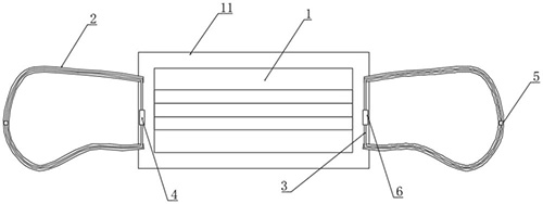 技术功效语段: [0016]延伸绳的设计,能够改变原有传统口罩通过挂耳绳穿戴的方式,通过延伸绳之间相互连接,从而绑在了后脑勺,避免绑耳朵,提升耳朵舒适感,同时延伸绳与挂耳绳中部的连接固定,加上延伸绳与挂耳绳的可拆卸连接,在不改变原有传统口罩的形式上,将延伸绳隐藏在挂耳绳上,使用户可以根据不同的需求,使用不同的穿戴方式,功能更多,可选择性强。 [0017]参照后文的说明和附图,详细公开了本实用新型的特定实施方式,指明了本实用新型的原理可以被采用的方式。应该理解,本实用新型的实施方式在范围上并不因而受到限制。
