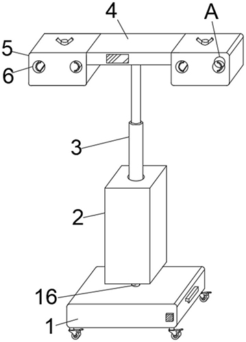 技术功效语段: [0016]1、本实用新型中,通过拉动拉杆,可使第二推块压缩第二弹簧,使得两个第一弹簧推动两个第一推块移动,从而使定位件贴服在固定孔内壁,方便置管插入固定孔内,随后放开拉杆,此时第二弹簧因自身弹力推开第二推块,使第二推块与第一推块相撞,使得定位件将置管稳定定位在固定孔内,实现了稳定固定置管的效果。 [0017]2、本实用新型中,通过开启发热电丝,可使发热电丝发热并将热量传递给定位件和保温件,最后将热量传递给置管内血液,实现对血液保温的效果,由于热量经过定位件和保温件才可传递置管,所以温度始终控制在36-38℃。 [0018]3、本实用新型中,通过开启安装架,可使定位架升降,实现升降调节的效果,通过开启气缸,可使齿条带动转轴和定位架转动,即可调节定位架的角度,方便人员使用。