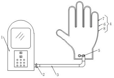 摘要: 本实用新型公开了临床康复仪器技术领域的一种脑卒中肩手综合征治疗仪,充气接头的右侧连通设置有充气管,充气管远离充气接头的一端设置有充气手套,充气手套包括手套外层,手套外层的内部设置有手套内层,手套外层与手套内层之间设置有充气层;患者的手在套上充气手套后,通过柔性加热膜可对手套内层的手掌部位进行加热,从而到达对患者手部加热的功能,在天气寒冷时可促进血液的循环,增加使用的效果,同时在手套内层的内壁前后端面的手掌区和手指区均设置了按摩凸块,在对充气手套进行充气时,按摩凸块会对患者的手部进行挤压按摩刺激,同时患者也可通过家人或者陪诊人员按压充气手套,从而通过设置的按摩凸块对手部进行穴位的按摩刺激。