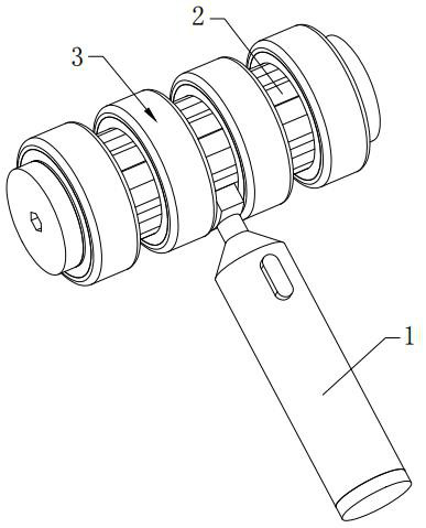 摘要: 本实用新型提供了一种按摩器,包括:主体结构、按摩组件以及理疗组件;其中,主体结构包括手柄以及镂空圆筒,手柄的前端一体设有连接杆,连接杆的前端固定安装有连接座,镂空圆筒固定安装在连接座上,按摩组件包括若干个按摩轮,若干个按摩轮均转动套装在镂空圆筒上,且若干个按摩轮沿着镂空圆筒的轴向呈等距布置,理疗组件包括透明石英管、灯座以及远红外灯管,透明石英管安装在镂空圆筒的内部。本实用新型提供的按摩器,同时具备按摩功能以及理疗功能,在对患者的肢体进行按摩的过程中,远红外灯管发出的远红外线穿过镂空圆筒以及相邻按摩轮之间的缝隙照射在患者的皮肤上,可以对受到损伤的皮肤起到促进修复的作用。