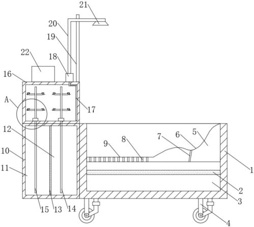 技术功效语段: [0029]1.新型妇产科婴儿洗浴盆,包括洗浴盆,所述洗浴盆的一侧固定设置有用于存储冷热水的水箱,所述水箱的上方设置有用于供水箱中的冷热水进入而预先调温的调水箱,所述调水箱上设置有将调水箱中调节好水温的水喷洒出的喷洒组件,婴儿可在洗浴盆中座落在隔板上进行洗浴,具体的,婴儿的臀部位于弧形凹槽中,腿部位于平躺区的上方,使得婴儿不容易溺水,保护性强,且弧形凹槽的设计使得婴儿躺在背靠区上时不易滑落。 [0030]2.新型妇产科婴儿洗浴盆,洗浴盆的一侧设置有存储冷热水的水箱,水箱中的冷热水会进入调水箱中进行调节到合适的温度后再通过喷洒组件喷出,使得喷洒出的水温稳定性较强,不会出现忽冷忽热使得婴儿出现烫伤或者着凉的现象,安全防护性强,可用于婴儿洗浴使用。 [0031]参照后文的说明和附图,详细公开了本实用新型的特定实施方式,指明了本实用新型的原理可以被采用的方式。应该理解,本实用新型的实施方式在范围上并不因而受到限制。