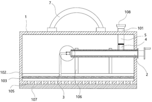 技术功效语段: [0017]一种擦拭器,包括容纳装置,所述容纳装置表面设置有加液口,所述容纳装置内固定安装有固定板和出液板,所述固定板位于所述出液板上方,所述出液板上开设有出液口,所述容纳装置底部开设有出液孔,所述固定板上固定安装有至少两个支撑柱,所述支撑柱上设置有储液针筒,所述容纳装置底面连接有粘贴层;所述储液针筒一侧设置于所述容纳装置外,所述储液针筒另一侧通过出液导管向所述出液板加注液体,所述液体能够从所述出液口流动至所述容纳装置的底部并从所述出液孔流出至所述粘贴层,所述储液针筒上开设有进液口,所述进液口通过加液管连通于所述加液口。本申请能够让使用者方便快捷的按压出液体,同时将粘贴层上的纸张浸湿,便于使用者对需擦拭部位进行擦拭,提高了使用者的擦拭效率,使用方便,实用可靠,防止用户直接接触需要擦拭的物品。 [0018]应当理解的是,以上的一般描述和后文的细节描述仅是示例性和解释性的,并不能限制本申请。