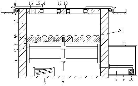 摘要: 本实用新型公开了一种中医护理用熏蒸桶,涉及熏蒸桶技术领域,包括熏蒸桶体,熏蒸桶体的内部固定安装有顶板,顶板的内部开设有通槽,顶板的内部固定安装有环形槽,环形槽的内部固定安装有充气气囊,熏蒸桶体的两侧均固定安装有安装板,安装板的顶部开设有滑槽,本实用新型的有益效果为:通过利用第二电机带动齿轮进行旋转,利用齿轮与齿条啮合连接,可以带动挡板进行移动,同时带动滑块在滑槽的内部滑动,利用挡板移动可以对顶板的顶部的通槽进行遮挡,可以根据情况调节密封孔的使用状态,防止水蒸气大多数不受控制地露出浪费,同时将小腿插入桶中时,借用环形槽内部的充气气囊可以对腿部进行包裹,提高了桶体的密封性和实用性。