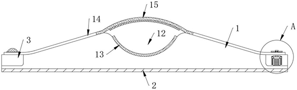 技术功效语段: [0012]1、利用设置的立柱、压板和扭簧之间的结合使用,可以对压带的位置进行压紧限位处理,从而可以防止压带在对导管固定的过程中出现松动的现象,进而导致导管脱落的风险,当立柱被纵向拉动时会使压板运动处回缩槽的内侧,随后向外侧拉动压板,使两侧的压板与立柱呈90度张开,同时压板转动时会带动扭簧随之发生形变,结合其形变所产生的反向作用力即可使压板对压带的位置进行压紧限位处理; [0013]2、利用设置的复位弹簧以及导向块的结合使用,可以实现立柱的纵向往复运动,同时可以提高立柱纵向运动过程中自身的稳定性,当立柱纵向运动时会拉动复位弹簧,并使其发生形变产生反向作用力,结合该反向作用力即可在施加给立柱的拉力消失时使其进行复位,而导向块的设置会在立柱纵向运动时沿着导向杆进行滑动,以此来提高立柱纵向运动过程中自身的稳定性。