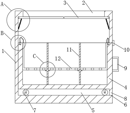 技术功效语段: [0025]1.一种医院供应室用侧开型污物转运箱,包括;转运箱,所述转运箱呈矩形箱体结构,转运箱的内部设置有内部槽体,转运箱的上方设置有连通于内部槽体上方的投掷口,所述投掷口中设置有单向密封组件,所述转运箱的一侧设置有连通内部槽体内部的滑槽,转运箱用于收集污物时,污物直接丢弃在投掷口中,污物会压合活动封板以铰接杆为轴向下转动,从而将污物收集在抽屉式箱体中,而活动封板上端由于侧边槽上方内壁抵触,活动封板只可向下单向打开,避免了污物从转运箱上方掉落的现象。 [0026]2.一种医院供应室用侧开型污物转运箱,污物收集在滤网的表面,滤网可用于固液分离,或者清洗时,液体的排出,便于污物的晾晒或清洗,达到回收再造利用的目的; [0027]3.抽屉式箱体通过锁扣锁紧,固定方便,抽屉式箱体不会从滑槽中滑出造成伤人或者出现污染排放的现象; [0028]4.抽屉式箱体底部的移动轮便于抽屉式箱体滑动,而阻挡框起到了将污物收集在滤网表面的作用,在将滤网取出时,可使得污物不会留在抽屉式箱体中; [0029]5.引导组件可供滤网垂直升降,便于污物顺利取出而不会因滤网倾斜出现掉落的现象,具体的导向杆在导向孔中滑动,供滤网垂直升降。