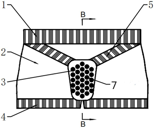技术功效语段: [0023]本实用新型提供的阴茎包皮环切术后护理装置主要由内裤本体、弹力束腰、弹力束腿、阴茎护罩、前斜拉弹力带以及后斜拉弹力带组成,由内凸反压底托、前斜拉弹力带、后斜拉弹力带、可拆卸压条等四者共同构成一个有效的反压系统,使阴茎体充分暴露,阴茎根部皮肤得到相对固定,当患者穿上内裤本体后,阴茎和阴囊通过内凸反压底托的“凸”字形开孔进入阴茎护罩内,此时内凸反压底托在前斜拉弹力带和后斜拉弹力带的共同拉力作用下,向后上方推压阴茎和阴囊的根部,小腹和会阴部内收,使阴茎体充分暴露并相对加长,阴茎根部皮肤也得到相对固定,阴茎的包扎物得到有效的固定; [0024]此外,设置的阴茎护罩相对扁平,不会过于凸出,可以避免患者尴尬。