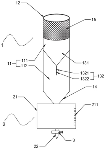 技术功效语段: [0031]本实用新型提供的尿液收集装置,包括引流组件和集尿组件,引流组件包括主体,调节结构设置于主体的一端,主体的另一端设置为锥形结构。通过设置调节结构,用于调节主体的端部松紧,使主体的端部更好的与患者阴茎相适配,避免过紧导致患者龟头水肿、过松引起漏尿的问题。通过在主体的内部设置单向流动控制结构,单向流动控制结构将主体的内部分隔为容置腔体和导流腔体,容置腔体包裹患者阴茎,在有尿液经过时单向流动控制结构打开,患者排尿后关闭,使尿液顺利进入至导流腔体后排出,避免尿液反流。通过在主体的另一端即导流腔体的端部设置锥形结构,以便于尿液顺利排放至集尿组件内,避免尿液积聚在主体内。通过设置尿袋与导流腔体连通,使尿液顺利进入至尿袋内进行收集后处理。整体结构简单,能提高患者的使用舒适性,且护理人员操作简便,可有效地减轻护理人员的负担,且避免伤害患者。