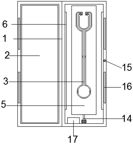 技术功效语段: [0016]本实用新型提供了一种心内科听诊器的消毒设备,具备以下有益效果:[0017](1)、本实用新型通过设置箱门、压力传感器、PLC和电机,使用者关上箱门,箱门按压压力传感器,压力传感器传出信息到PLC,PLC发出指令到电机转动。[0018](2)、本实用新型通过设置听诊器支架板、听诊器凹槽、听诊器、凹槽、矩形凹槽、活塞、夹块、J形勾、限位块和密封圈,使用者打开箱门,压力传感器传出信息到PLC,PLC发出指令到电机转动,使听诊器支架板的正面对准箱门,向下拉动两个J形勾,同时把听诊器放置到两个J形勾上,两个J形勾带动两个最上活塞向下移动到限位块处,凹槽内的气体进入矩形凹槽内推动两个中部活塞和最下方两个活塞移动,两个中部活塞和最下方两个活塞带动中部两个夹块和最下方两个夹块运动,保持听诊器呈垂直状态,同时夹住听诊器防止转动时听诊器甩动。