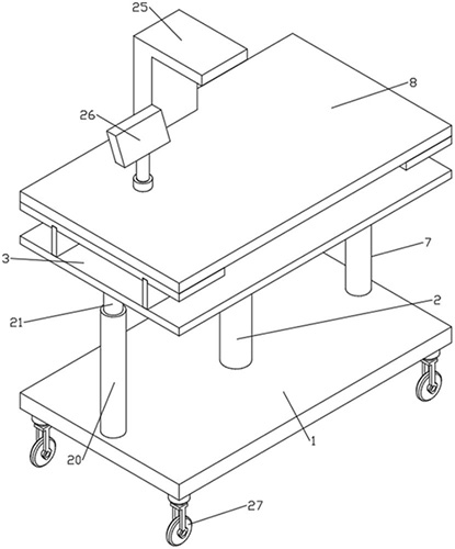 摘要: 本实用新型公开了一种病案室用病案查阅装置,包括底板、套筒、安装板、升降结构、转动杆、固定转台、桌板、限位结构和导向结构,所述底板上侧设有套筒,所述底板上方设有安装板,所述安装板同底板之间设有升降结构,所述安装板上侧设有转动杆,所述转动杆上侧设有固定转台,所述固定转台上方设有桌板,所述安装板同底板之间设有限位结构,所述桌板同固定转台之间设有导向结构。本实用新型与现有技术相比的优点在于:可以调整高度;资料摆放的面积可以扩大。
