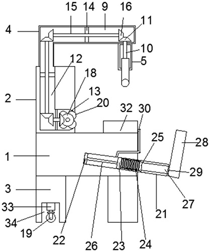 技术功效语段: [0016]本实用新型提供了一种心内科患者锻炼设备,具备以下有益效果:[0017](1)、本实用新型通过设置锻炼盒、第一转杆、第一锥形齿轮、摇手、第一L形凹槽、第二转杆、第二锥形齿轮、第二L形凹槽、圆槽、圆环A、第三转杆、第三锥形齿轮、第四转杆、第四锥形齿轮、弧形按摩块,使用者转动两个摇手,两个摇手带动第一转杆和第一锥形齿轮转动,第一锥形齿轮带动第二锥形齿轮和第二转杆转动,第二锥形齿轮带动最上方第三锥形齿轮和最上方第三转杆沿第一L形凹槽转动,最上方第三锥形齿轮带动中部第三锥形齿轮和中部第三转杆沿第二L形凹槽转动,中部第三锥形齿轮带动最下方第三锥形齿轮和最下方第三转杆转动,最下方第三锥形齿轮带动第四锥形齿轮、第四转杆和多个按摩块沿圆槽转动,通过转动的多个弧形按摩块来按摩使用者的腰部。[0018](2)、本实用新型通过设置直管、活塞、圆环B、弹簧、固定块、拉杆、推杆、踏板、限位环、软管、气囊组、束缚带,使用者用带有魔术贴的束缚带把气囊组绑在小腿上,用脚蹬踏板,踏板带动推杆和固定块拉动弹簧同时带动拉杆拉动活塞,活塞带动气体通过软管进入气囊组内,使用者收回脚,弹簧收缩带动固定块、推杆和踏板运动,固定块推动拉杆和活塞运动,气囊组内的气体通过软管回流,通过气囊组的胀缩来按摩使用者的小腿。