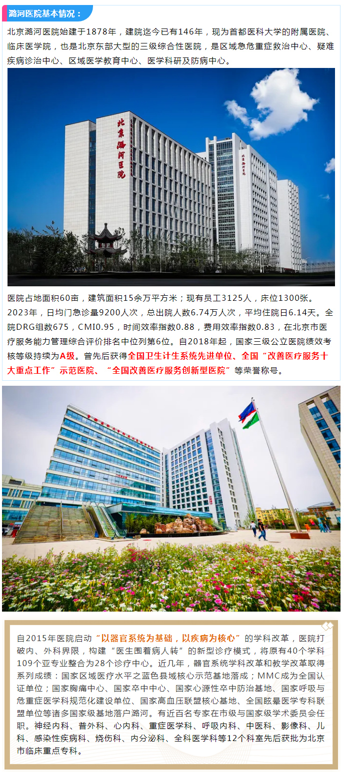 北京潞河医院简介首都医科大学附属北京潞河医院始建于1878年,迄今已有147年历史,现为区域急危重症救治中心、疑难疾病诊治中心、区域医学教育中心和医学科研及防病中心。经过一个多世纪的发展,医院已经成为集医疗、教学、科研、防病为… 详细>>