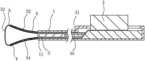 摘要: 本申请涉及一种激光夹石篮。该激光夹石篮包括鞘管、驱动机构、激光头、三个夹臂以及三条拉丝;鞘管设有开口;驱动机构安装于鞘管;激光头位于鞘管内,激光头朝向开口;夹臂位于鞘管外,三个夹臂绕鞘管中心轴间隔分布,夹臂为管状;拉丝包括依次连接第一延伸段,第一段,伸展段和第二段,第二延伸段,第一延伸段和第二延伸段位于鞘管内,第一段穿过其中一个夹臂,第二段穿过另一个夹臂,伸展段位于夹臂远离鞘管的一侧,第一延伸段的一端和第二延伸段的一端与驱动机构相连,驱动机构通过拉动第一延伸段和第二延伸段,以使夹臂远离鞘管的一端往鞘管中心轴收拢。本申请提供的方案,能够对准结石进行碎石并取走碎石。