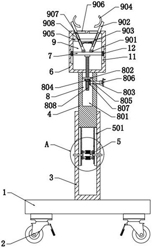技术功效语段: [0012]本实用新型的一种支架,根据使用需求,按压调节杆,调节伸缩杆在固定杆内部位移,从而调节支架的整体长度,医护人员可以对患者腿部调整到舒适的姿势进行支撑,转动把手,带动转轴上的锥齿轮二转动,进而使螺纹杆转动带动调节板上下位移,进而带动活动杆在金属块上滑动,进而活动杆上的夹持座患者腿部进行夹持,省力方便。