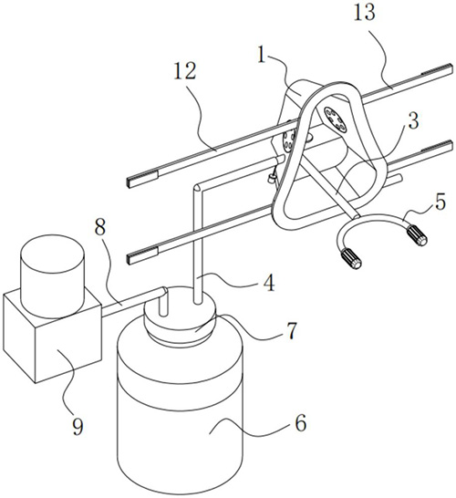 技术功效语段: [0015](1)本实用新型在帕金森患者正常使用面罩吸氧的情况下,能够对其口中产生的口水具有吸取并收集的效果;[0016](2)本实用新型三叉吸管和吸水头均为柔软的塑料材质,在口腔中可以发生弹性变形,适应口腔环境;[0017](3)本实用新型中中间段与面部接触的部分有凹槽的支撑,使吸孔尽可能少的与面部接触,从而降低面部的不适感;[0018](4)本实用新型中标线的配合透明瓶体的设置,让人员能够直观的看出收集瓶中收集口水的量,以便及时的倒出收集的口水;[0019](5)本实用新型中所述堵头能够堵住连接管,在患者不需要使用吸口水组件时,堵头插入到连接管的一端,避免一些杂质进入到连接管中;[0020](6)本实用新型中通过长带和短带配合,可使两者的连接处位于患者头部的侧边,便于患者处于躺姿的情况下佩戴和拆除面罩。