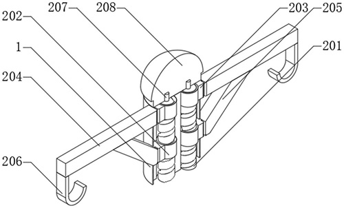 摘要: 本实用新型涉及输液架技术领域,且公开了一种儿科用输液架,包括立柱,所述立柱的内部设置有升降机构,升降机构包括两个螺纹柱,每个螺纹柱的外表面均螺纹连接有两个螺纹套,每组螺纹套的外表面均固定连接有两个滑块,每个滑块的外表面均与立柱的内壁相接触,其中两个滑块远离螺纹柱的一端均固定连接有横杠,另两个滑块远离螺纹柱的一端均固定连接有支撑柱,每个支撑柱的上表面均与横杠的底面固定连接,每个横杠的底面均固定连接有吊钩,每个螺纹柱的内壁均固定连接有转轴,两个转轴的顶端共同转动连接有顶盖。该儿科用输液架,通过支撑柱连接螺纹套,保证在横杠和支撑柱同步运动,避免了横杠长度过长,支撑点不足导致横杠折断的问题。